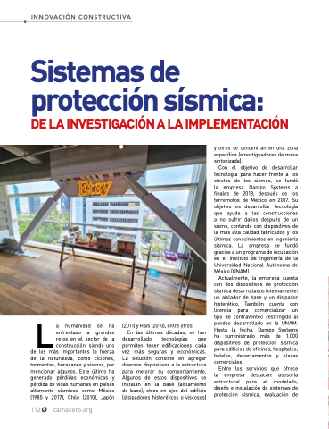 y otros se concentran en en una zona específica (amortiguadores de masa sintonizada) Con el objetivo de de desarrollar tecnología para hacer frente a a a a a a a los los efectos de los los sismos se fundó la empresa Dampo Systems a a a a a finales de de de de 2018 después de de de de los terremotos de de de de de México en 2017 Su objetivo es es es desarrollar tecnología que ayude a a a a a a a a las construcciones a a a a a a no sufrir daños después de de de de un sismo contando con con dispositivos de de de la más alta calidad fabricados y los últimos conocimientos en en en ingeniería sísmica La empresa se fundó gracias a a a a a a a a a a a un un programa de de de incubación en en el Instituto de de de de Ingeniería de de de de la Universidad Nacional Autónoma de de de México (UNAM) Actualmente la empresa cuenta con dos dos dispositivos de de protección sísmica desarrollados internamente: un un aislador de de base y un un disipador histerético También cuenta con licencia para comercializar un tipo de de de contraventeo restringido al al pandeo desarrollado en en la la la UNAM Hasta la la la fecha Dampo Systems ha ha suministrado más de de 1 000 dispositivos de de de protección sísmica para edificios de de de oficinas hospitales hoteles departamentos y plazas comerciales Entre los servicios que ofrece la la empresa destacan: asesoría estructural para el el modelado diseño e e e e e e e e e e e instalación de de de de sistemas de de de de protección sísmica evaluación de de de L a a a a a a a a á a a a a a a a humanidad se se ha enfrentado a a a a a a a a grandes retos en en en en el sector de de la construcción siendo uno de de los más importantes la la fuerza de de la la naturaleza como ciclones tormentas huracanes y sismos por mencionar algunos Este último ha generado pérdidas económicas y pérdida pérdida de vidas humanas en en en países altamente sísmicos como México (1985 y 2017) Chile (2010) Japón