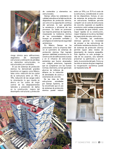 entreun10%yun15%elcostode la estructura considerando el el el costo costo de de de de los dispositivos Incluso el el uso uso de de de sistemas de de de protección sísmica en estructuras estructuras metálicas permite competir con con el costo de de estructuras estructuras de de concreto logrando un equilibrio económico entre ambas propuestas y y resultando de de gran interés como mayor mayor rapidez en en la la construcción mayor mayor limpieza en en en la la obra y y y facilidad de de supervisión de de esta entre otros En Colombia las condiciones sísmicas generan la la la necesidad de de proveer a a a a a a a a a las estructuras de de suficiente resistencia sísmica sísmica El uso de de de sistemas de de de protección sísmica sísmica permite lograr altos niveles de de de de de desempeño de de de manera asequible Esto significa no no solo proteger la vida de los usuarios sino también preservar su su patrimonio y por lo lo tanto la economía del país Como se se ha visto en sismos de de de gran magnitud la recuperación económica puede ser bastante lenta riesgo sísmico para edificaciones diagnóstico del desempeño estructural estructural y estimación de de de pérdidas en en en en elementos estructurales estructurales no estructurales estructurales y en en en en contenidos El uso de de de de sistemas de de de de protección sísmica ha demostrado grandes beneficios en en lugares como como México tales como: reducción de de los costos de de de la la estructura entre un 10% y 15% reducción de de las cargas sobre la la cimentación lo lo que resulta en en en ahorro en en en en los los costos de de de mejor control de de de de los los desplazamientos laterales y prevención de de de de daños en en e la la construcción mejora del desempeño estructural y protección 1° SEMESTRE 2023 113