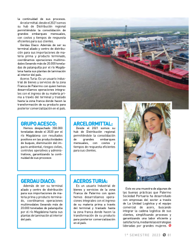 eficientes para sus clientes Gerdau Diaco: Además de de de ser su su terminal aliado y centro de de de de distribu- ción para sus importaciones de de ma- teria prima y producto terminado coordinamos operaciones multimo- dales llevando más de de 20 000 tonela- das de de de palanquilla por el el río Magda- lena hasta sus plantas de de de laminación al interior del país Aceros Turia: Es un usuario indus- trial de de de bienes y servicios de de de la zona Franca de de de de Palermo con quien hemos desarrollamos operaciones integra- les con el el ingreso de de de su materia pri- ma ma a a a a a a a a a a a a a a a a través del terminal y traslado hasta la la la zona franca donde hacen la la la transformación de de su producto para posterior comercialización en el país Esto es es una una muestra de de algunas de de las buenas prácticas que Palermo Sociedad Portuaria ha desarrollado con empresas del sector a a a a a a a a a a a a través de de de La Unidad Logística y el el equipo comercial de de de de acero buscando integrar la cadena logística de de de sus clientes simplificando procesos y y garantizando una labor eficiente y y satisfactoria mediantelasestrategias lideradas por grandes mujeres GRUPO ACESCO: