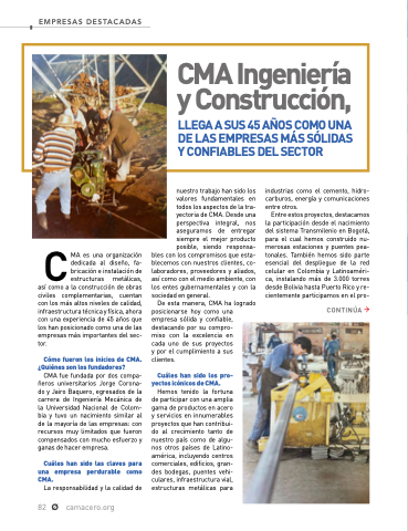 yectos icónicos de CMA Hemos tenido la fortuna de de participar con una una amplia gama de de productos en en acero y y servicios en en innumerables proyectos que han contribui- do al al crecimiento tanto de de nuestro país país como de de de algu- nos otros países de de Latino- américa incluyendo centros comerciales edificios gran- des bodegas puentes vehi- culares infraestructura vial estructuras metálicas para industrias como el cemento hidro- carburos energía y comunicaciones entre otros Entre estos proyectos destacamos la participación desde el el nacimiento del sistema Transmilenio en en en Bogotá para el el cual hemos construido nu- merosas estaciones y puentes pea- tonales También hemos sido parte esencial del despliegue de de de la la red celular en en Colombia y Latinoaméri- ca instalando más de de de 3 000 torres desde Bolivia hasta Puerto Rico y re- cientemente participamos en en en el pro-