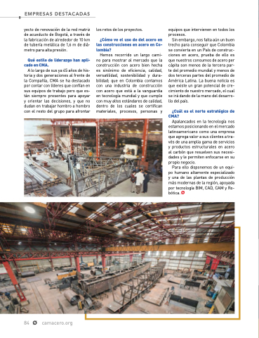 Hemos recorrido un largo cami- no para mostrar al mercado que la la construcción con con acero bien hecha es sinónimo de eficiencia calidad versatilidad sostenibilidad y dura- bilidad bilidad que en en Colombia contamos con con con con una industria de construcción con con con acero que que está a a a á a a a a a a a la vanguardia en tecnología mundial y y que que cumple con muy altos estándares de de de calidad dentro de de de los cuales se certifican materiales procesos personas y equipos que intervienen en en en todos los procesos Sin embargo nos falta aún un buen trecho para conseguir que Colombia se se convierta en en un País de de construc- ciones en en acero acero prueba de de de ello es es es que nuestros consumos de de de acero acero per cápita son menos menos de de de de la tercera par- te te te te del del promedio promedio mundial y menos menos de de de de de dos terceras partes del del promedio promedio de de de de América Latina La La buena noticia es es que existe un gran potencial de de cre- cimiento de de de de de nuestro mercado el el cual se irá dando de de de de de la mano del del desarro- llo del país ¿Cuál es es el norte estratégico de CMA?