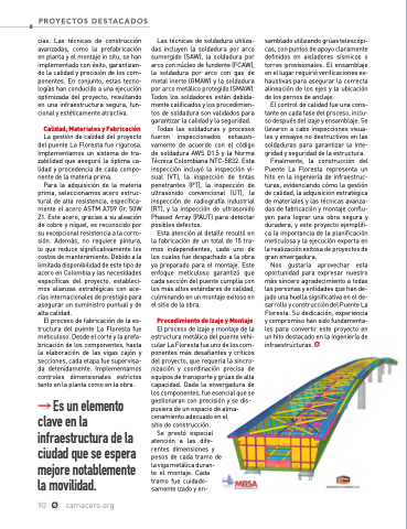 La La gestión de de de calidad del del proyecto del del puente La La Floresta fue rigurosa Implementamos un sistema de de tra- zabilidad que aseguró la óptima ca- lidad lidad y procedencia de de de cada compo- nente de de de de la la la materia prima Para la la la adquisición de de la la la materia materia prima seleccionamos acero estruc- tural de alta resistencia específica- mente el acero acero ASTM A709 Gr 50W Z1 Este acero acero gracias a a a a a a a su aleación de cobre y níquel es es reconocido por su excepcional resistencia a a a a á a la corro- sión Además no requiere pintura lo lo que reduce significativamente los costos de de de mantenimiento Debido a a a a a a a a la limitada disponibilidad de de de de este tipo de de de de acero en Colombia y y las necesidades específicas del proyecto estableci- mos alianzas estratégicas con ace- rías internacionales de de prestigio para asegurar un un suministro puntual y de de alta calidad El proceso de de de fabricación de de de la es- tructura del puente La Floresta fue meticuloso Desde el el corte y la prefa- bricación de de de los los componentes hasta la la la elaboración de de las vigas cajón y secciones cada etapa fue supervisa- da da da detenidamente Implementamos controles dimensionales estrictos tanto en en en la la la planta como en en en la la la obra Es un elemento clave en la la infraestructura de la la la ciudad que se espera mejore notablemente la movilidad 90 camacero org