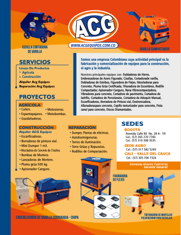 Somos una empresa Colombiana cuya actividad principal es es la fabricación y comercialización de equipos para la construcción el agro y la industria Nuestros principales equipos son: Dobladoras de de de de Hierro Enderezadoras de de de de de de Acero Figurado Figurado Cizallas Cortadorade varilla Dobladoras de de de de de de Estribos Figuradora de de de de de de Flejes Mezcladoras para Concreto Pluma Grúa Certicada Trituradora de de de Escombros Rodillo Compactador Apisonador Canguro Rana Vibrocompactadora Vibradores para concreto Cortadora Cortadora Cortadora Cortadora de de de de pavimento Cortadora Cortadora Cortadora Cortadora de de de de ladrillo Cortadora Cortadora Cortadora Cortadora de de de de de Porcelanato Cortadora Cortadora Cortadora Cortadora de de de de de Adoquín Manual Escaricadoras Borradora de de de Pintura vial Destroncadora Allanadoraspara concreto concreto concreto Cepillo texturizador para para para concreto concreto concreto Flota canal para para concreto concreto Discos Diamantados EE