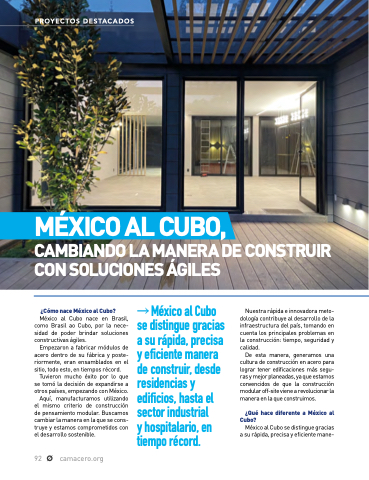 México México al al Cubo Cubo Cubo nace nace en Brasil Brasil como Brasil Brasil ao Cubo Cubo por la nece- sidad de de poder brindar soluciones constructivas ágiles Empezaron a á a a a a á a fabricar módulos de de de acero dentro de de de su fábrica y poste- riormente eran ensamblados en en en en en el sitio todo esto en en en en tiempos récord Tuvieron mucho éxito por lo que se se se tomó la decisión de de expandirse a a a a a otros países empezando con México Aquí manufacturamos utilizando el mismo criterio de de construcción de de pensamiento modular Buscamos cambiar la la la manera en en en la la la que se cons- truye y y estamos comprometidos con con el desarrollo sostenible México al Cubo se distingue gracias a a a á a a a a su rápida precisa y eficiente manera de de de de construir desde residencias y edificios hasta el sector industrial y hospitalario en tiempo récord Nuestra rápida e e e e e e innovadora meto- dología contribuye al desarrollo de de de la infraestructura del país tomando en en en cuenta los principales problemas en en en la construcción: tiempo seguridad y calidad De esta manera generamos una cultura de construcción en en en acero para lograr tener edificaciones más segu- ras y y mejor planeadas ya que que estamos convencidos de que que la la la la construcción modular off-site viene a a a a a a a a revolucionar la la la la manera en en la la que construimos ¿Qué hace diferente a a a México al Cubo?